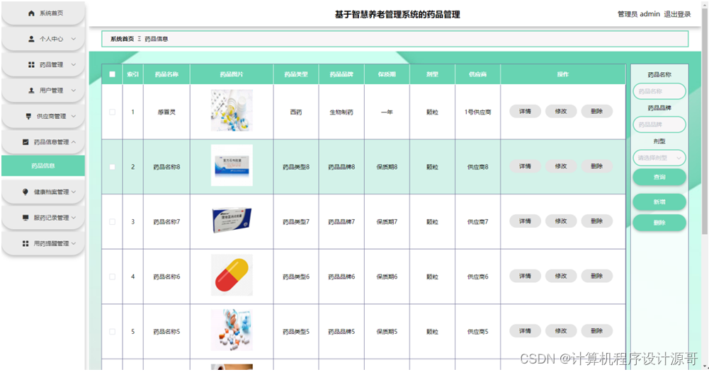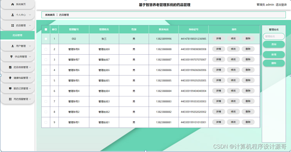 管理员点击药品管理。在药品管理页面输入管理姓名进行查询,新增或删除药品管理列表;并根据需要对药品管理详细信息进行详情、修改或删除操作。如图5-3所示: