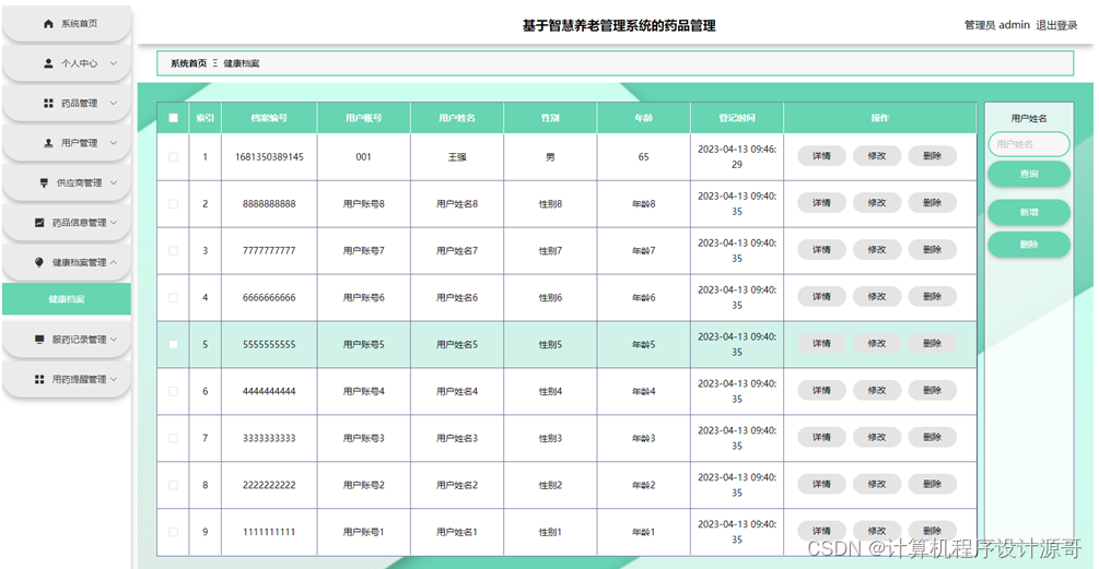 管理员点击健康档案管理。在健康档案页面输入用户姓名进行查询,新增或删除健康档案列表;并根据需要对健康档案详细信息进行详情、修改或删除操作。如图5-7所示: