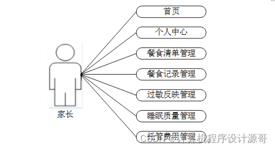 家长:家长登录进入系统可以实现对首页,个人中心,餐食清单管理,餐食记录管理,过敏反映管理,睡眠质量管理,托管费用管理等进行操作。家长用例如图3-2所示。