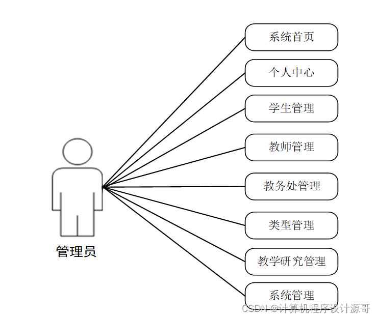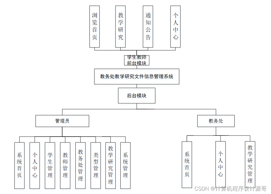 管理员后台主要功能是:系统首页、个人中心、学生管理、教师管理、教务处管理、类型管理、教学研究管理、系统管理等功能。系统功能模块图如图4-1所示。
