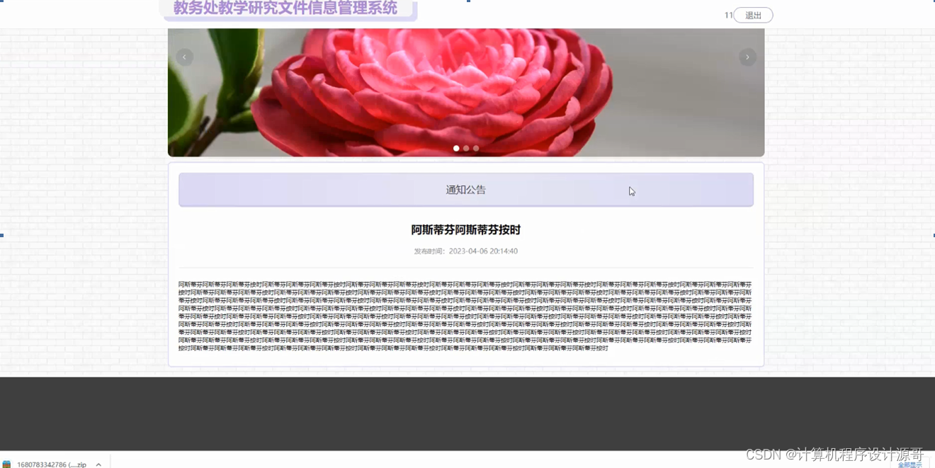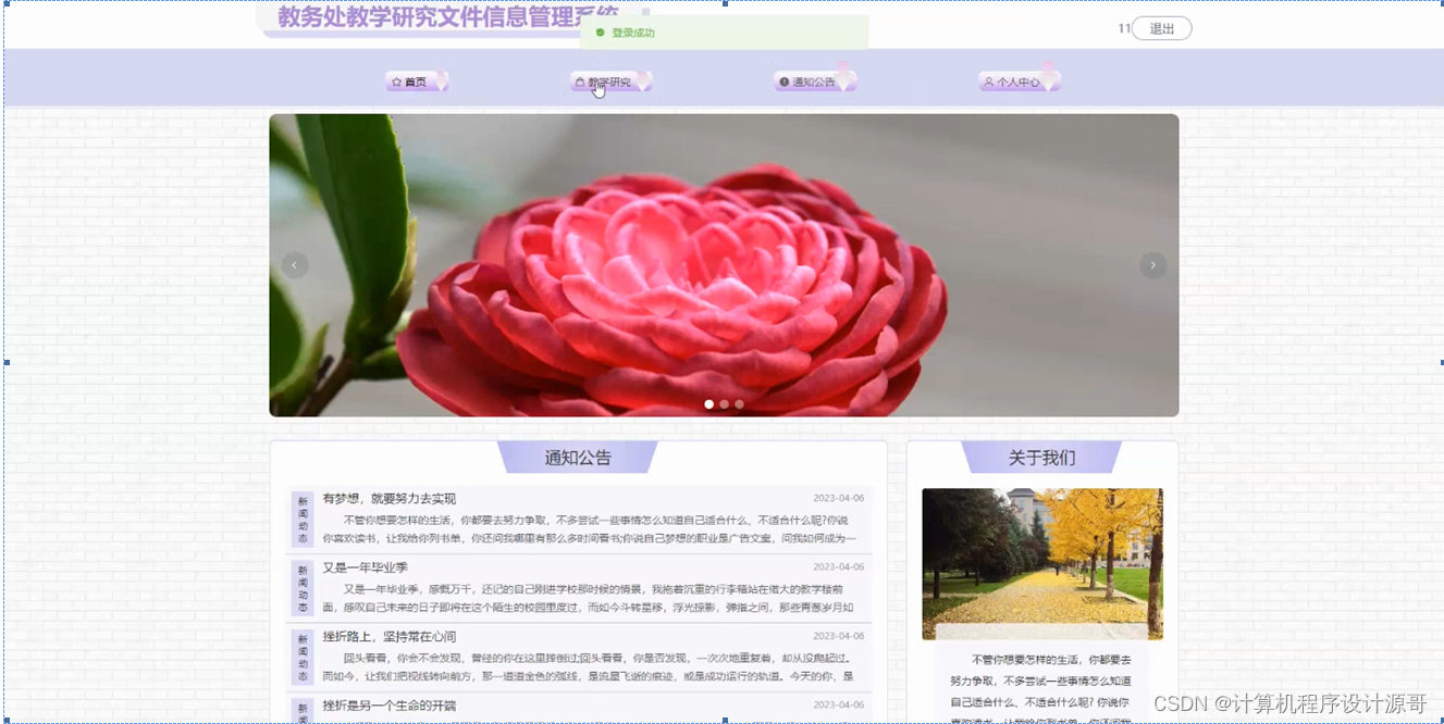 当游客打开系统的网址后,首先看到的就是首页界面。在这里,游客能够看到教务处教学研究文件信息管理系统的导航条显示首页、教学研究、通知公告、个人中心等。系统首页界面如图5-1所示: