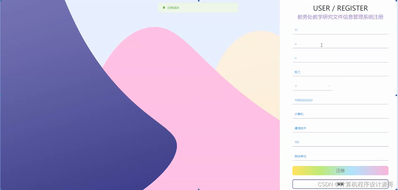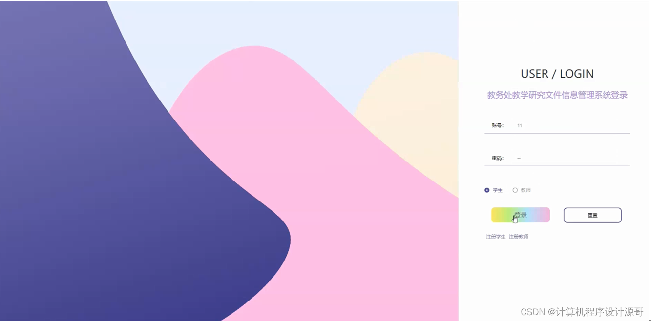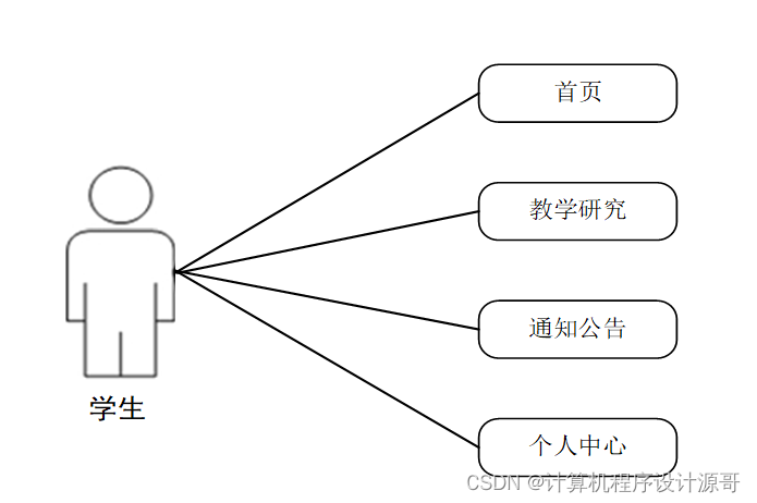 学生的功能主要是对个人账号和密码进行更新管理,然后对首页、教学研究、通知公告、个人中心进行查询详情操作。