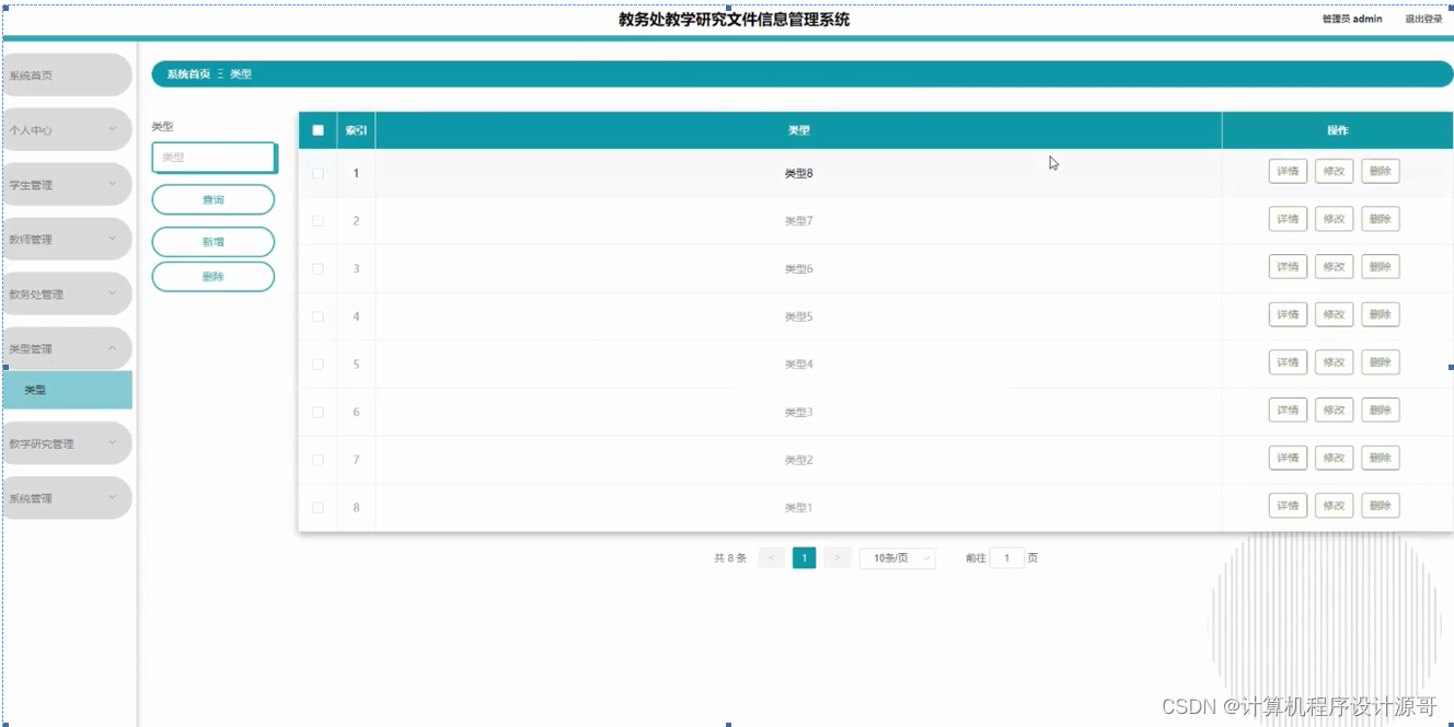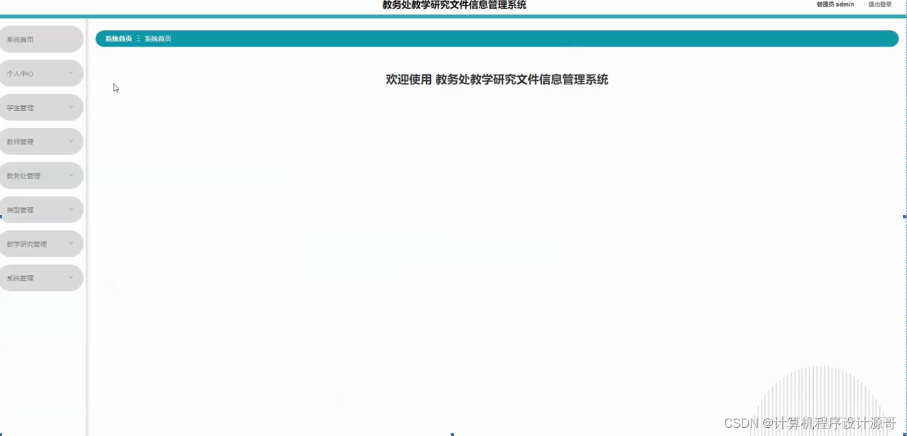 管理员登录到系统后台后,可以对系统首页、个人中心、学生管理、教师管理、教务处管理、类型管理、教学研究管理、系统管理等功能模块进行管理;如图5-10所示。