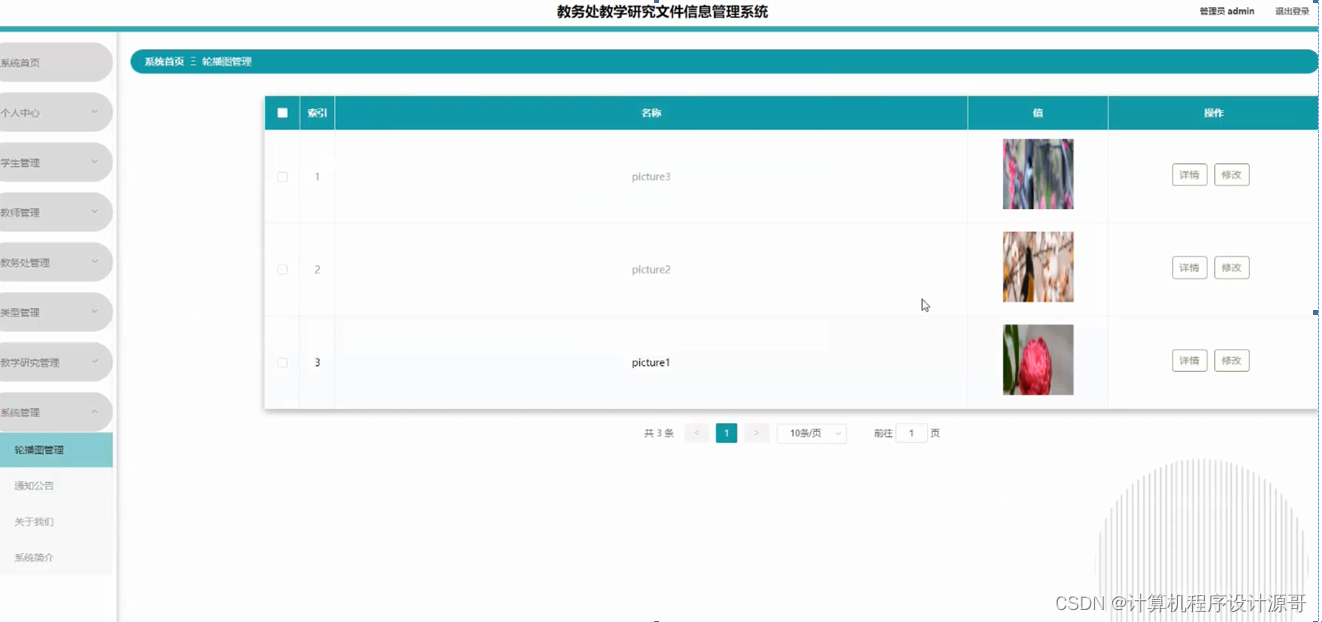 管理员端的功能主要是开放给系统的管理人员使用,能够对用户的信息进行管理,包括对教学研究进行查看,修改和删除、新增等,对系统整体运行情况进行了解。