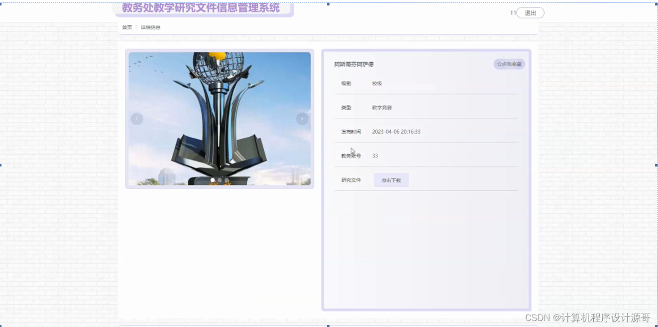 学生点击教学研究;在教学研究页面的搜索栏输入名称、级别,进行查询,然后可以查看名称、级别、图片、类型、研究文件、发布时间、教务账号等信息,如有需要可以点击下载、收藏等操作;如图5-4所示。