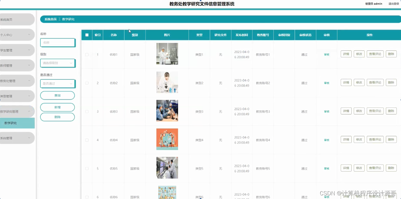 管理员点击教学研究管理,在教学研究管理页面,对名称、级别、图片、类型、研究文件、发布时间、教务账号、审核回复、审核状态、审核等内容,进行查询或者删除教学研究等操作,如图5-15所示。