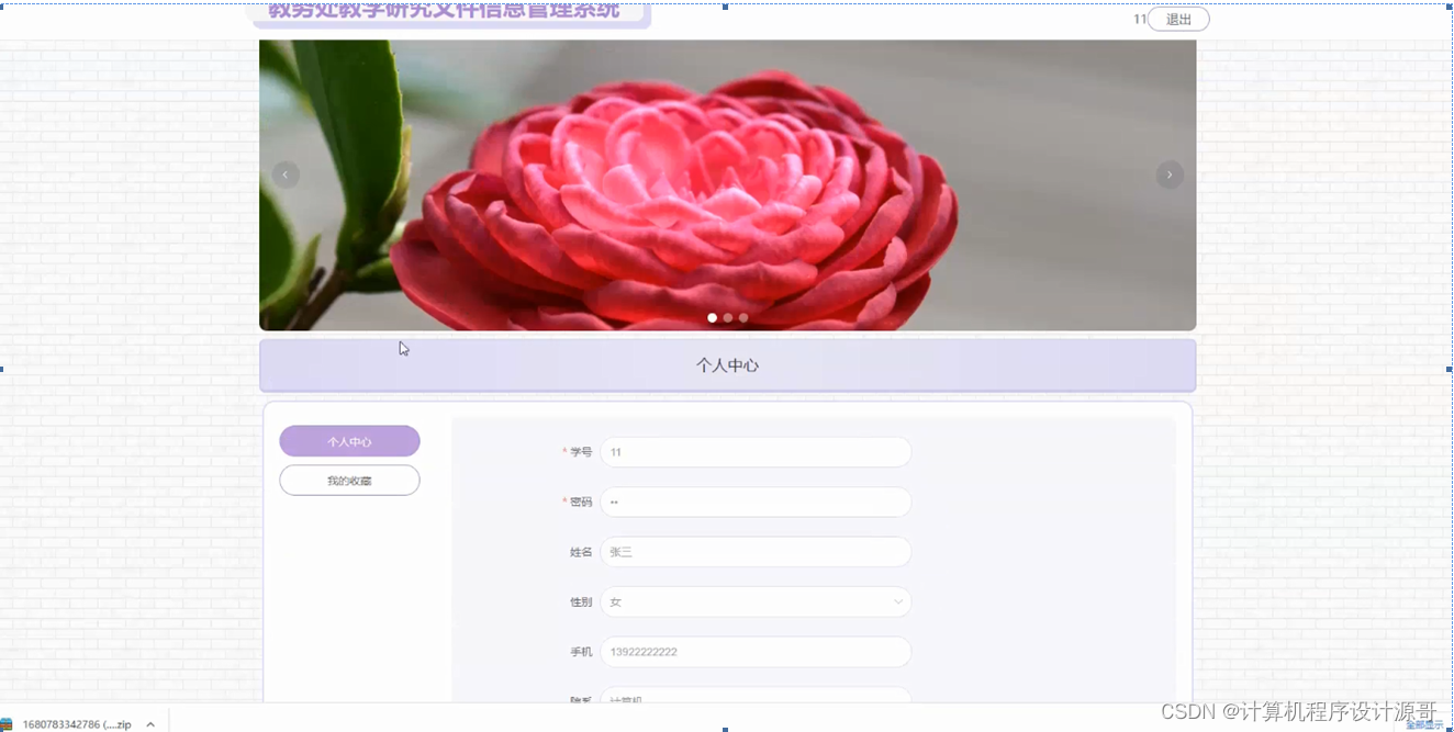 学生点击个人中心,在个人中心页面对学号、密码、姓名、性别、手机、院系、专业、班级、工作单位等信息,进行信息更新操作,还可以对我的收藏进行详细操作,如图5-6所示。
