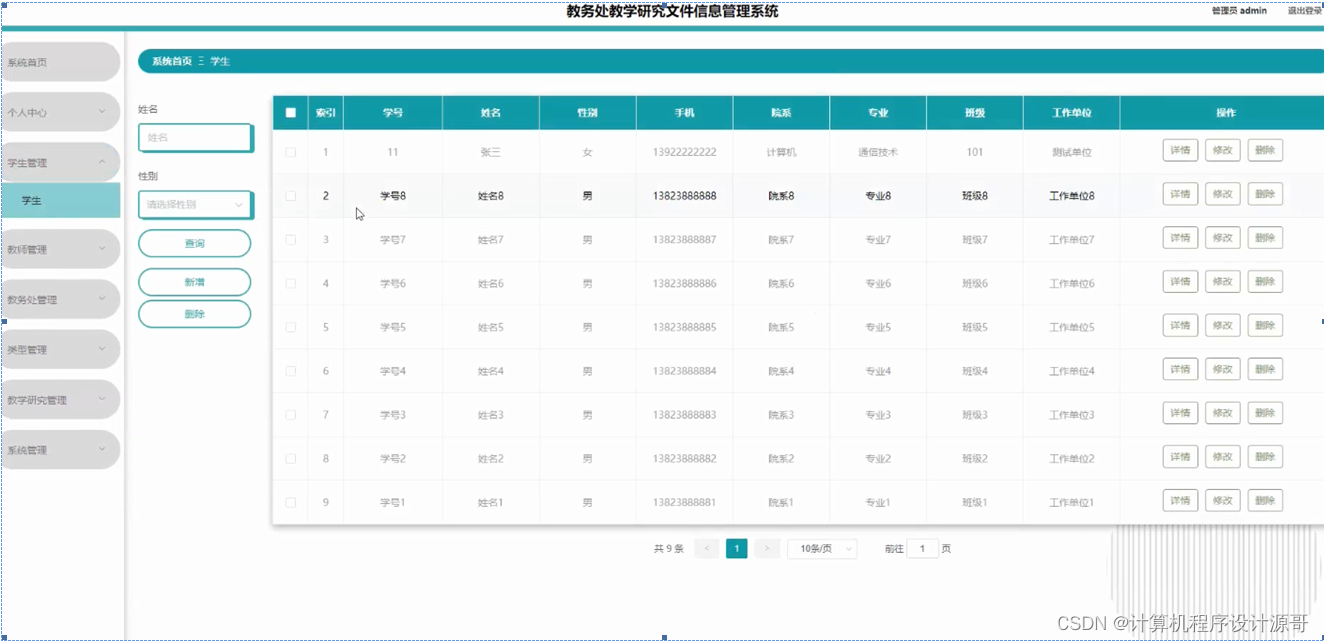 管理员点击学生管理,在学生管理页面,对学号、姓名、性别、手机、院系、专业、班级、工作单位等内容,进行查询、新增或者删除学生信息等操作,如图5-12所示。