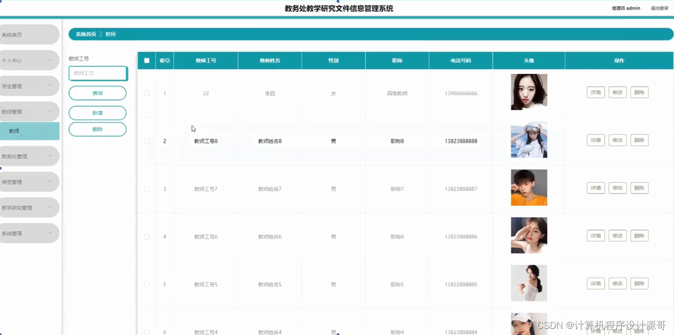 管理员点击教师管理,在教师管理页面,对教师工号、教师姓名、性别、职称、电话号码、头像等内容,进行查询、新增或者删除教师信息等操作,如图5-13所示。