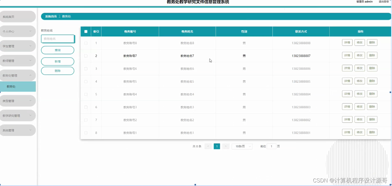 管理员点击教务处管理,在教务处管理页面,对教务账号、教务姓名、性别、联系方式等内容,进行查询或者新增、删除教务处信息等操作,如图5-11所示。