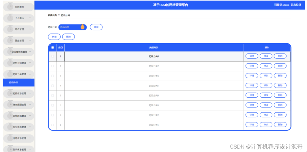 管理员点击药品分类管理。在药品分类页面输入药品分类进行查询、新增或删除药品分类列表,并根据需要对药品分类详情信息进行详情、修改或删除操作;如图5-12所示: