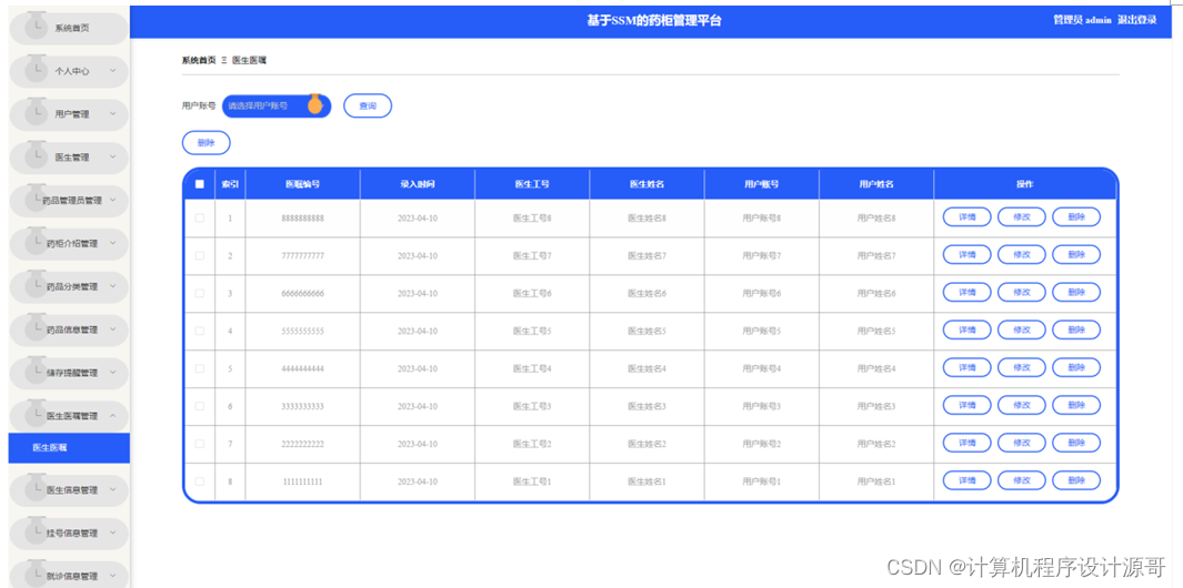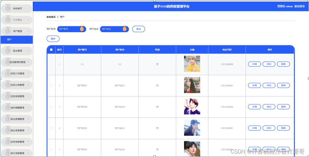 管理员点击用户管理。在用户页面输入用户账号、用户姓名进行查询或删除用户列表,并根据需要对用户详情信息进行详情、修改或删除操作;如图5-8所示: