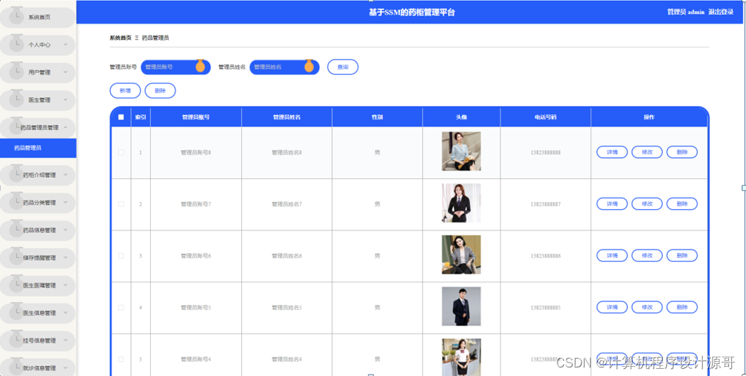 管理员点击药品管理员管理。在药品管理员页面输入管理员账号、管理员姓名进行查询、新增或删除药品管理员列表,并根据需要对药品管理员详情信息进行详情、修改或删除操作;如图5-10所示: