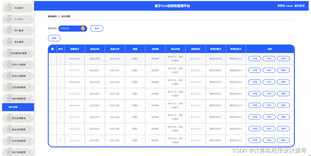 管理员点击储存提醒管理。在储存提醒页面输入药品名称进行查询或删除储存提醒列表,并根据需要对储存提醒详情信息进行详情、修改或删除操作;如图5-14所示: