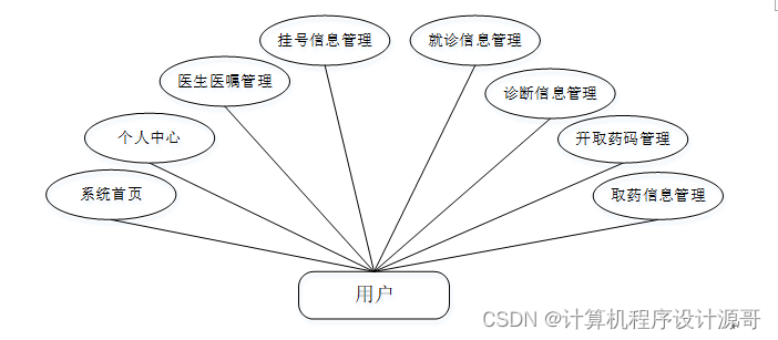 (3)、用户关键功能包含系统首页、个人中心、医生医嘱管理、挂号信息管理、就诊信息管理、诊断信息管理、开取药码管理、取药信息管理等进行管理。用户用例如下: