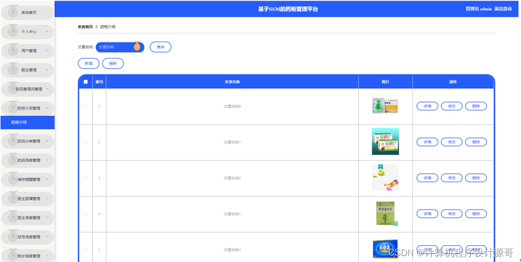 管理员点击药柜介绍管理。在药柜介绍页面输入文章名称进行查询、新增或删除药柜介绍列表,并根据需要对药柜介绍详情信息进行详情、修改或删除操作;如图5-11所示: