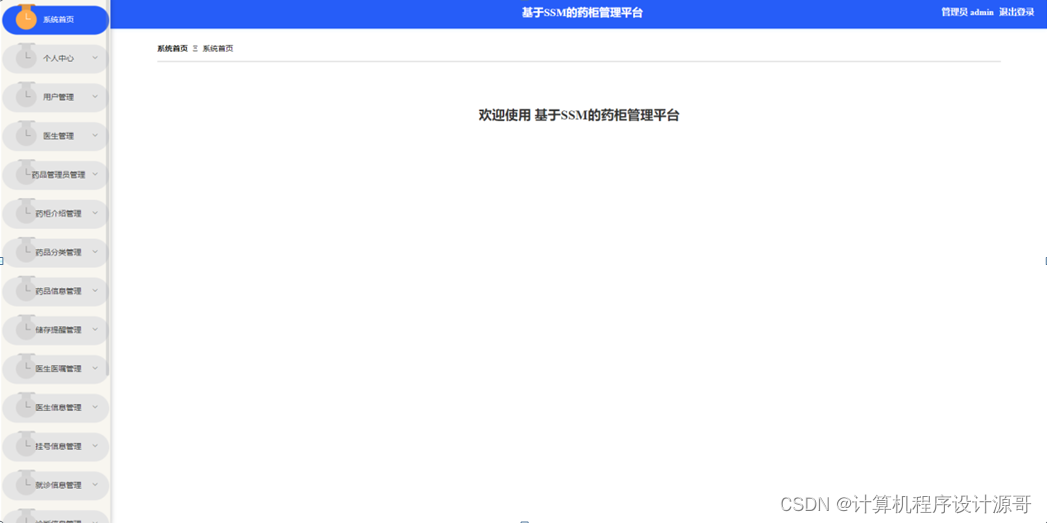 管理员进入主页面,主要功能包括对系统首页、个人中心、用户管理、医生管理、药品管理员管理、药柜介绍管理、药品分类管理、药品信息管理、储存提醒管理、医生医嘱管理、医生信息管理、挂号信息管理、就诊信息管理、诊断信息管理、开取药码管理、药柜信息管理、取药信息管理、留言板、系统管理等进行操作。管理员主页面如图5-7所示: