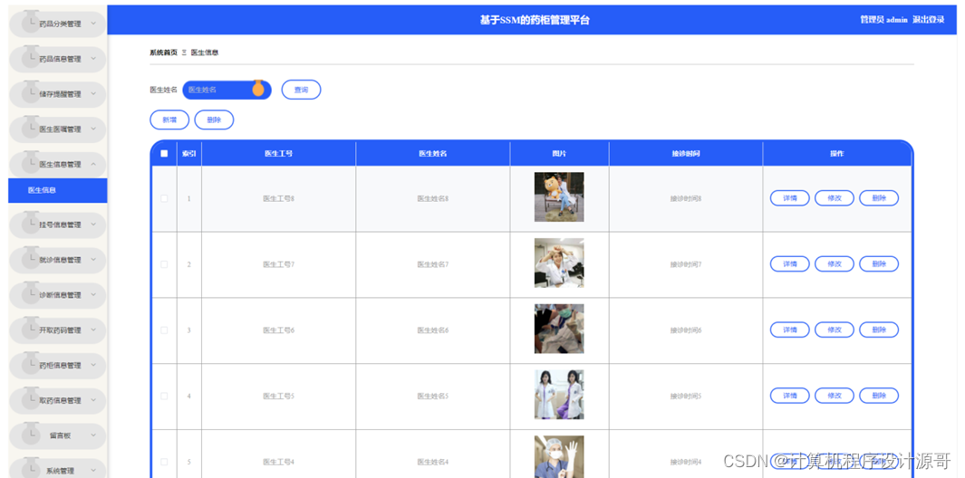 管理员点击医生信息管理。在医生信息页面输入医生姓名进行查询、新增或删除医生信息列表,并根据需要对医生详情信息进行详情、修改或删除操作;如图5-16所示: