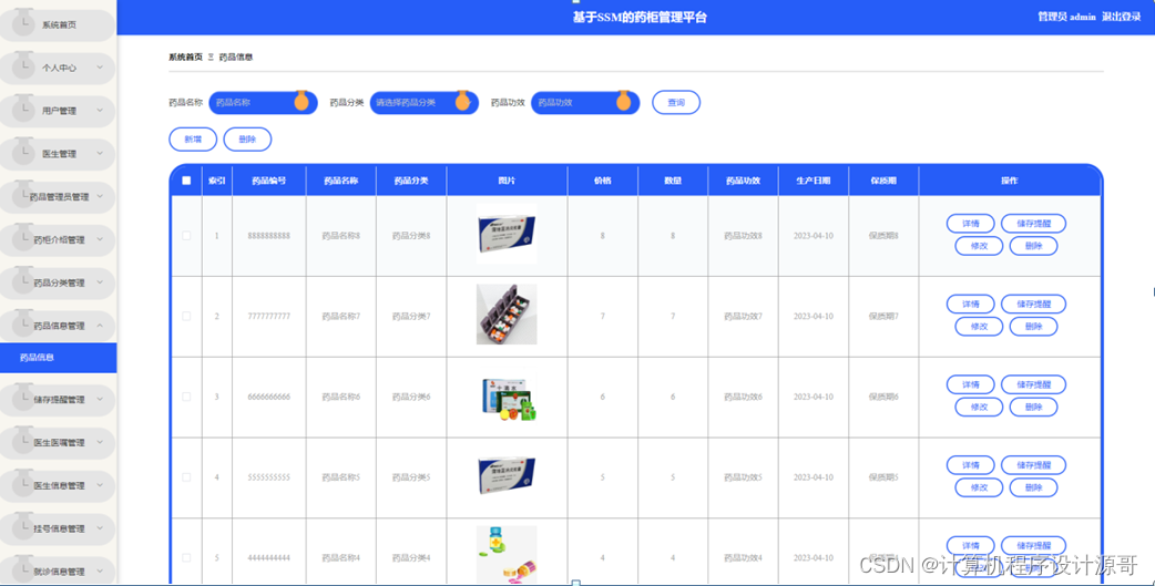 管理员点击药品信息管理。在药品信息页面输入药品名称、药品分类、药品功效进行查询、新增或删除药品信息列表,并根据需要对药品详情信息进行详情、储存提醒、修改或删除操作;如图5-13所示: