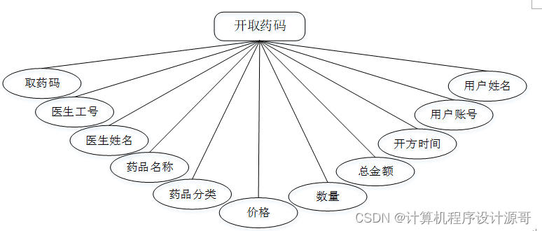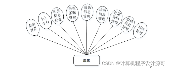 (4)、医生关键功能包含系统首页、个人中心、药品信息管理、医生医嘱管理、就诊信息管理、诊断信息管理、开取药码管理、取药信息管理、系统管理等进行管理。医生用例如下: