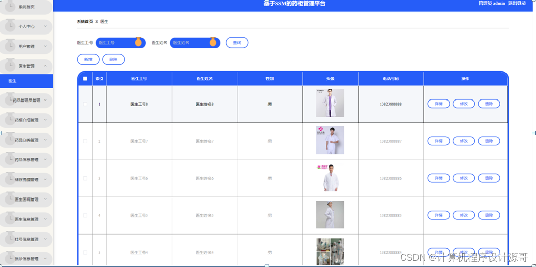 管理员点击医生管理。在医生页面输入医生工号、医生姓名进行查询、新增或删除医生列表,并根据需要对医生详情信息进行详情、修改或删除操作;如图5-9所示:
