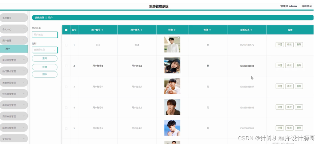 管理员点击用户管理:在用户管理页面,可以对用户账号、用户姓名、头像、性别、联系方式等信息,进行查询或者新增、删除用户信息等操作,如图5-9所示: