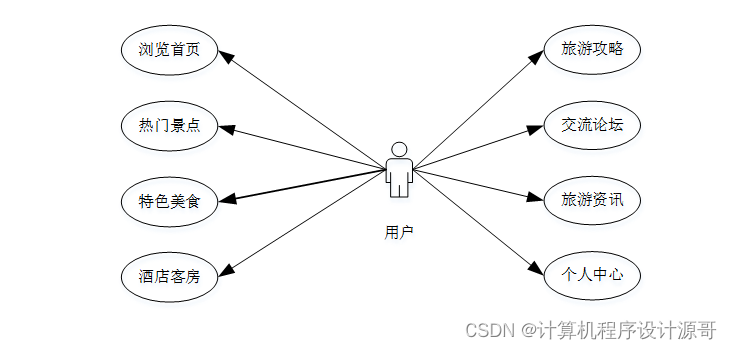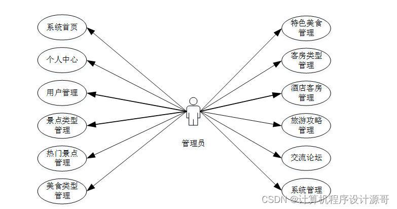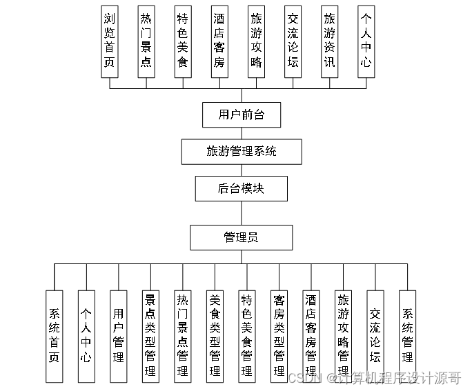 管理员模块属于是网站的后台,进入之后有大量的管理员功能,管理员也可以使用用户模块的功能,为了维护网站的稳定与页面的布局,将管理员模块的功能详细化后可以使用系统管理对页面进行布局修改,用户模块只可以对热门景点、特色美食、酒店客房、旅游攻略等进行查询等,并且更改个人信息,旅游管理系统总体结构图如图4-2所示。