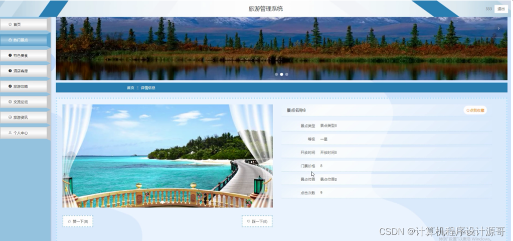 用户点击热门景点,在热门景点页面的搜索栏输入景点名称进行查询,然后可以查看景点名称、图片、景点类型、等级、开放时间、门票价格、景点位置、点击次数等信息,如果有需要可以点击收藏、评论等操作,如图5-4所示: