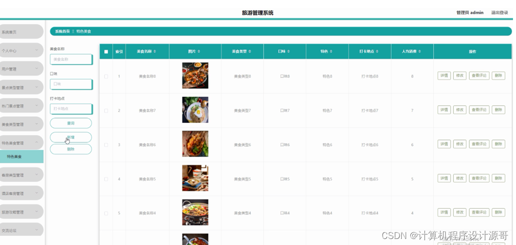 管理员点击特色美食管理:在特色美食管理页面,可以对美食名称、图片、美食类型、口味、特色、打卡地点、人均消费等信息,进行查询、新增或者删除特色美食等操作,如图5-11所示: