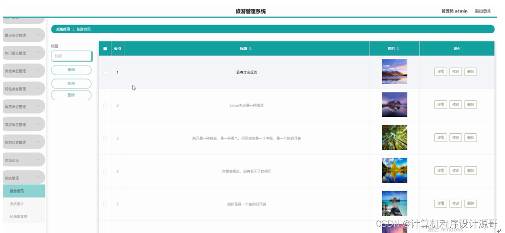 管理员点击系统管理,在系统管理页面对旅游资讯、系统简介、轮播图管理等信息,进行查询或新增、删除系统信息等操作。如图5-15所示: