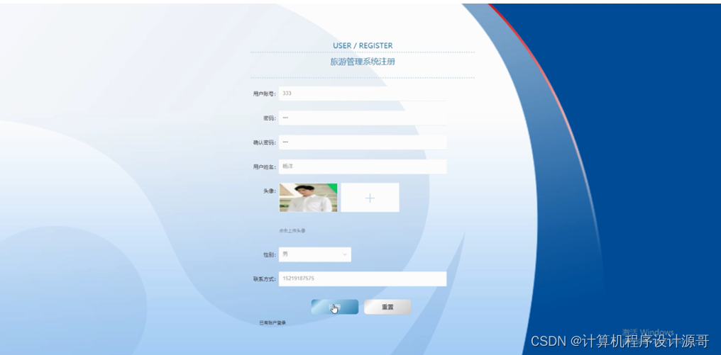这是一个用户注册的界面,当用户没有账户时可以通过注册来登录系统,只需要根据相应的提示,输入用户账号、密码、确认密码、用户姓名、头像、性别、联系方式等信息即可,点击注册操作;如图5-2所示: