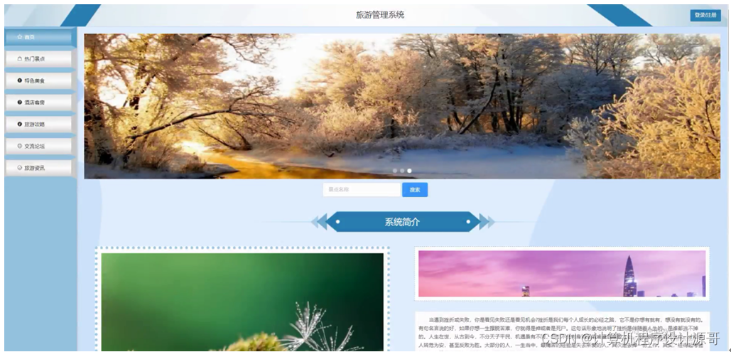 当游客打开系统的网址后,首先看到的就是首页界面。在这里,游客能够看到旅游管理系统的导航条显示首页、热门景点、特色美食、酒店客房、旅游攻略、交流论坛、旅游资讯等功能。如图5-1所示: