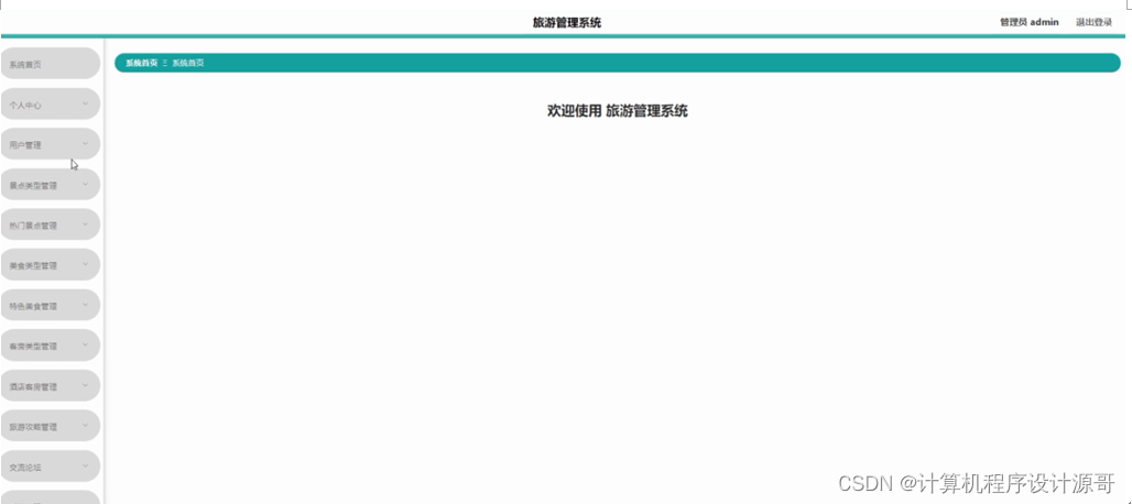 管理员进入系统,主要功能包括对系统首页、个人中心、用户管理、景点类型管理、热门景点管理、美食类型管理、特色美食管理、客房类型管理、酒店客房管理、旅游攻略管理、交流论坛、系统管理等功能进行操作。如图5-8所示: