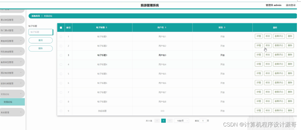 管理员点击交流论坛:在交流论坛页面,可以对帖子标题、用户名、状态等信息,进行查询、新增或者删除交流论坛等操作,如图5-14所示: