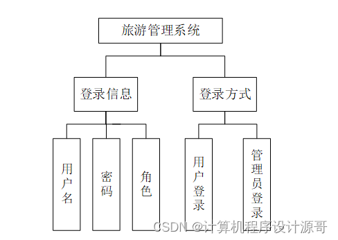 系统启动后,在登录界面,输入正确的账号、密码、角色,选择进入管理员界面或用户界面,管理员界面是用来管理页面与系统的所有功能,用户界面可以正常的使用,并对热门景点、特色美食等进行份内的操作,系统登录结构图如图4-1所示。