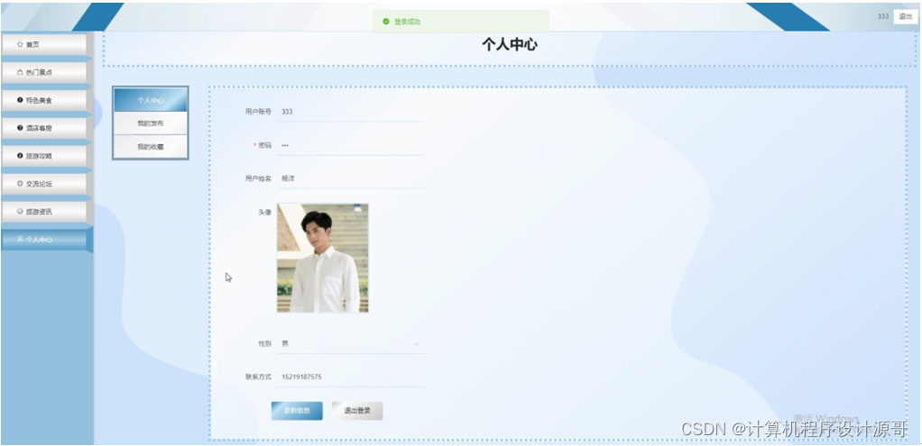 在个人中心页面可以更新个人详细信息,还可以对我的发布、我的收藏进行详细操作;如图5-6所示: