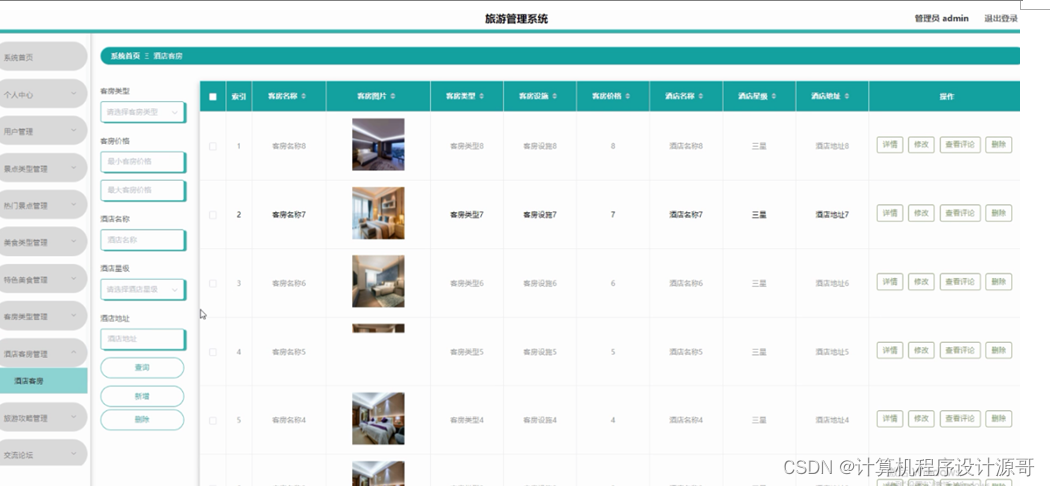 管理员点击酒店客房管理:在酒店客房管理页面,可以对客房名称、客房图片、客房类型、客房设施、客房价格、酒店名称、酒店星级、酒店地址等信息,进行查询、新增或者删除酒店客房等操作,如图5-12所示: