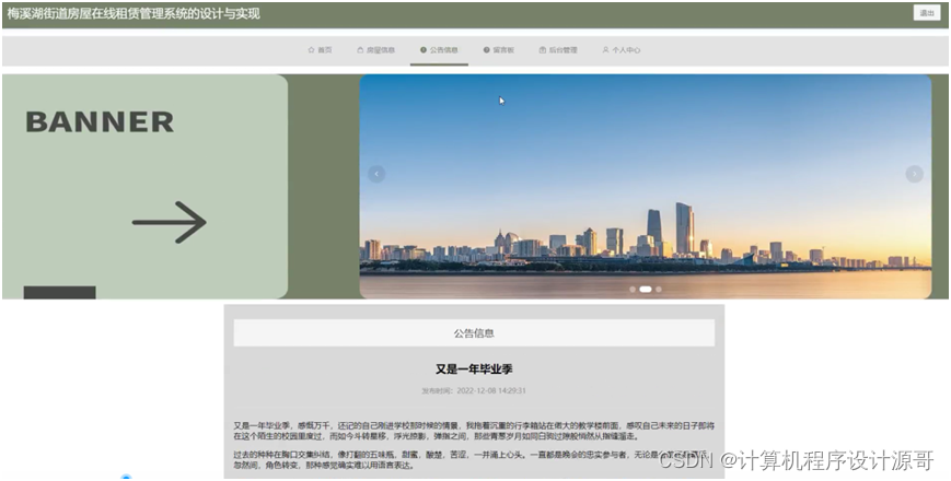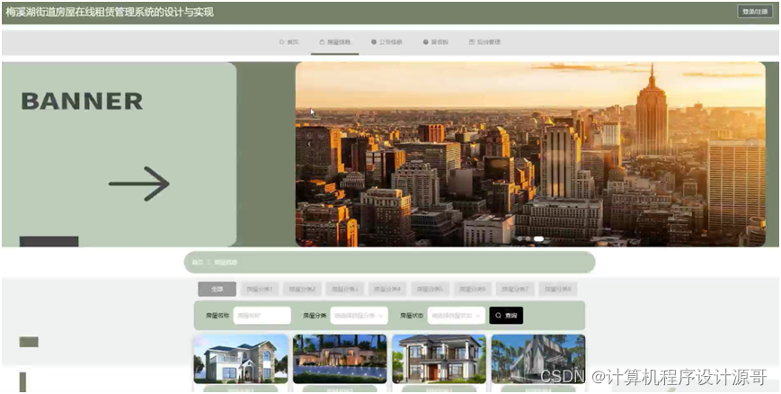 当人们打开系统的网址后,首先看到的就是首页界面。在这里,人们能够看到梅溪湖街道房屋在线租赁管理系统的导航条,通过导航条导航进入各功能展示页面进行操作。系统首页界面如图5-1所示: