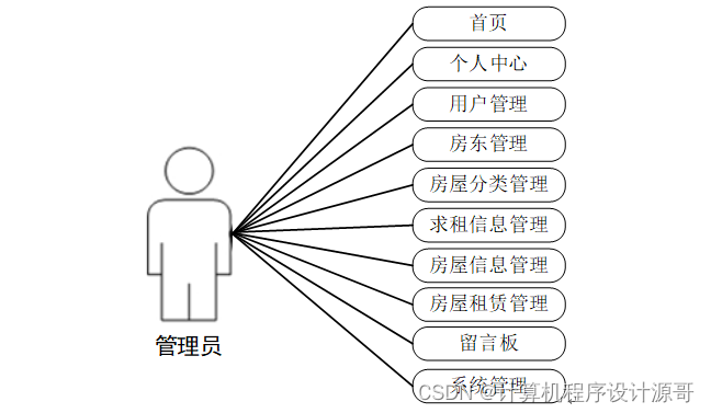 (2)管理员可以对首页,个人中心、用户管理,房东管理,房屋分类管理,求租信息管理,房屋信息管理,房屋租赁管理,留言板,系统管理等进行基本的信息管理。其用例分析如图3-2所示。
