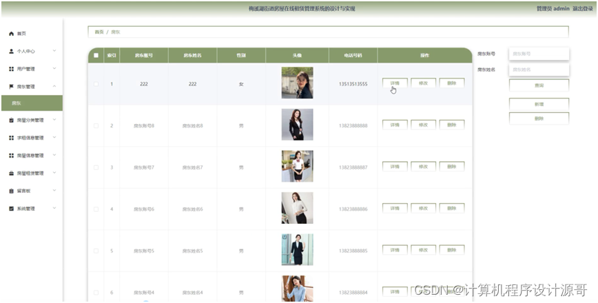 管理员点击房东管理。进入房东页面输入房东账号、房东姓名进行查询、新增或删除房东列表,并根据需要对房东详细信息进行详情、修改或删除操作。如图5-9所示: