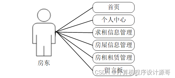 (3) 房东可以对首页,个人中心,求租信息管理,房屋信息管理,房租租赁管理,留言板进行操作,用例分析如图3-3所示。