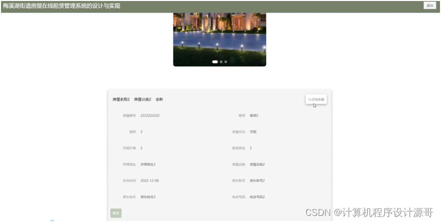 房屋信息:在房屋信息页面的输入栏中输入房屋名称,房屋分类,房屋状态进行查询,可以查看到房屋详细信息,并根据需要进行添加到租赁或收藏操作;如图5-3所示: