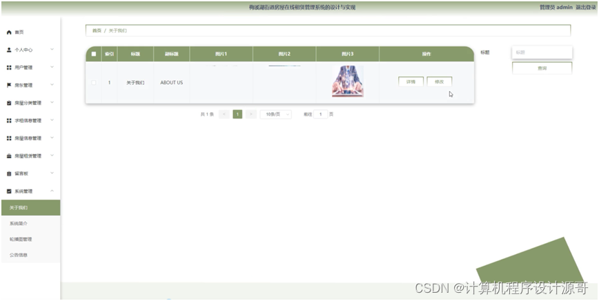 管理员点击系统管理。在关于我们页面输入标题进行查询列表,并根据需要对关于我们详细信息进行详情、修改操作,还可以对系统简介,轮播图管理,公告信息进行详细操作。如图5-12所示: