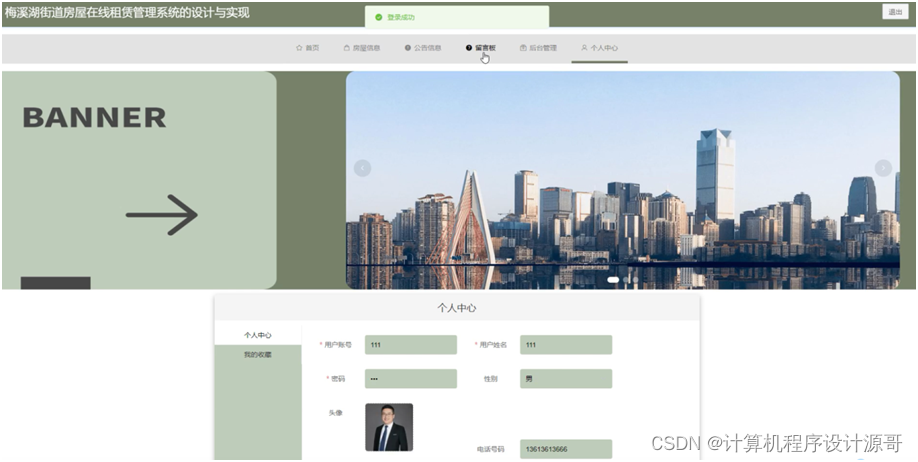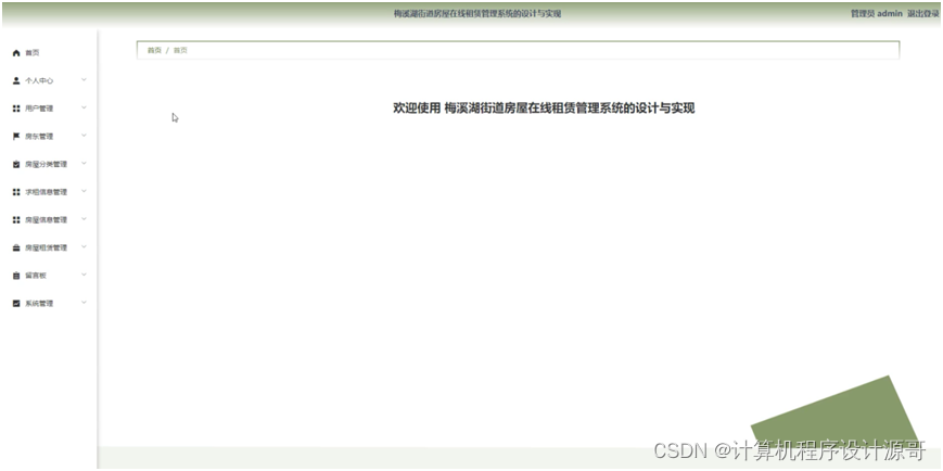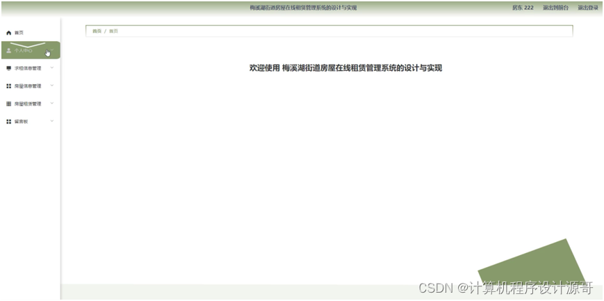 房东进入系统可以对首页,个人中心,求租信息管理,房屋信息管理,房租租赁管理,留言板等功能进行操作。房东主页面如图5-13所示: