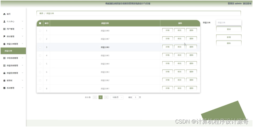 管理员点击房屋分类管理。在房屋分类页面输入房屋分类进行查询,新增或删除房屋分类列表,并根据需要对房屋分类详细信息进行详情、修改或删除操作。如图5-10所示: