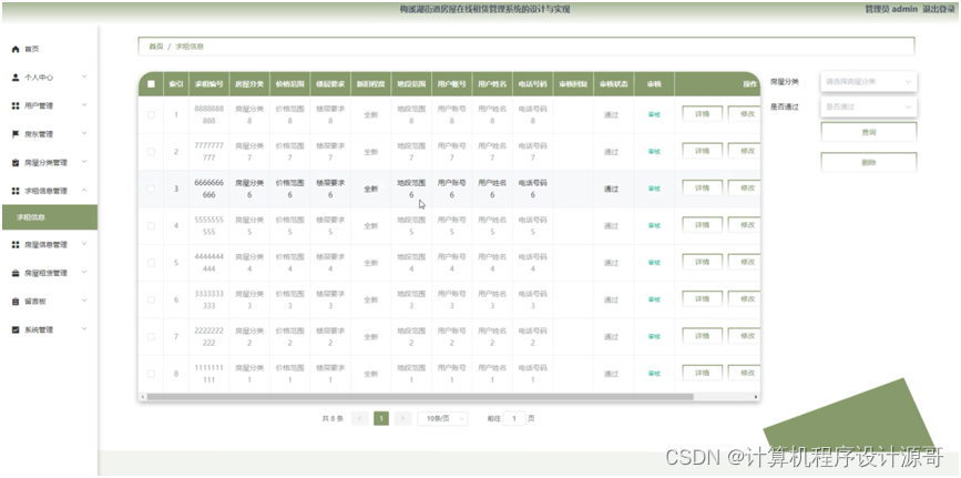 管理员点击求租信息管理。在求租信息管理页面输入房屋分类,是否通过进行查询或删除求租信息管理列表,并根据需要对求租信息管理详细信息进行详情、修改或删除操作。如图5-11所示: