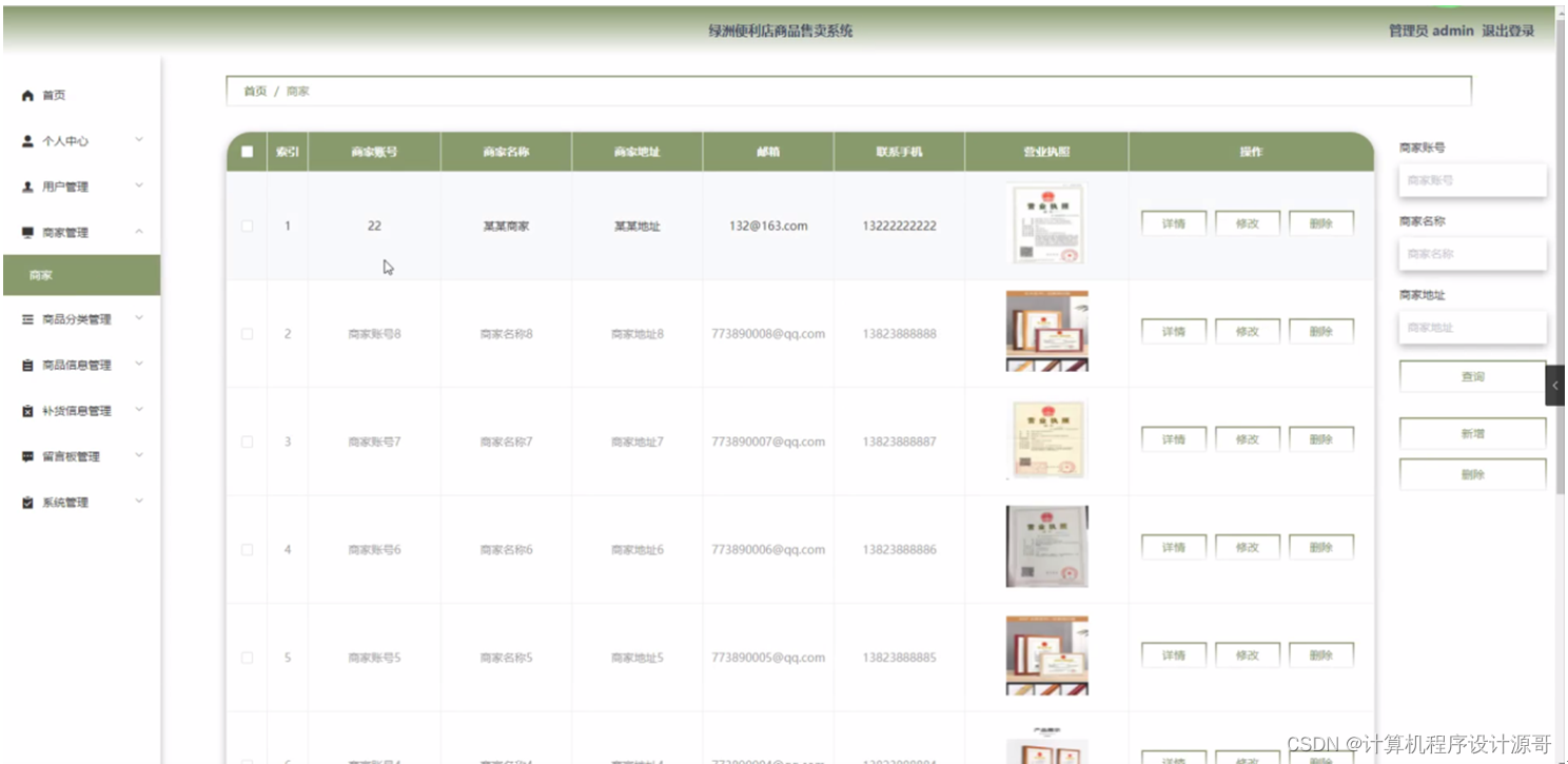 管理员点击商家管理。在商家页面输入商家账号、商家名称和商家地址进行查询、新增或删除商家列表,并根据需要对商家详情信息进行详情、修改或删除操作;如图5-10所示: