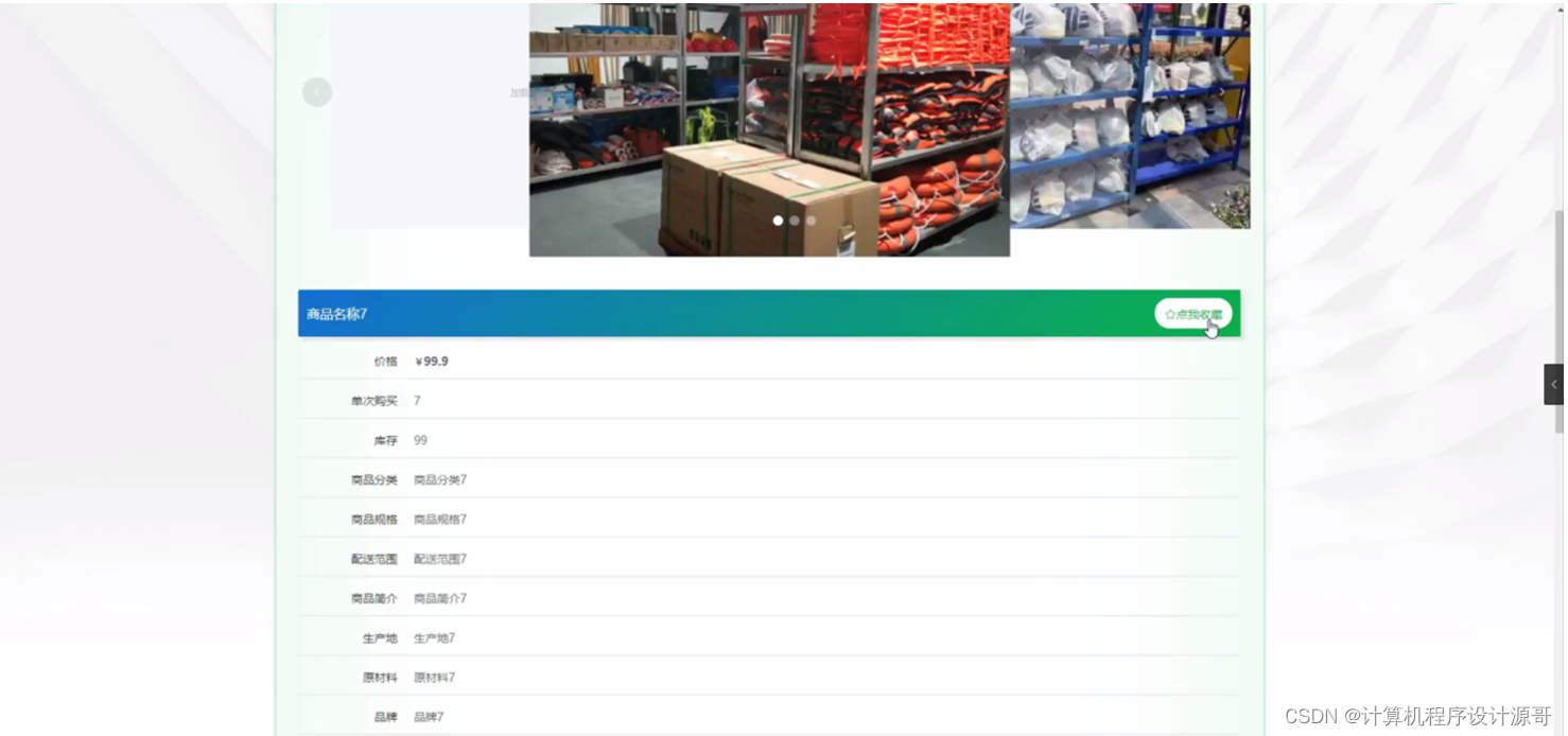 商品信息:在商品信息页面的输入栏中输入价格、单次购买、库存、商品分类、商品规格、配送范围、商品简介、生产地、原材料、品牌、上架日期、商家账号、商家名称、商家地址、联系手机进行查询,可以查看到商品信息详细信息,并根据需要进行添加到购物车、立即购买或收藏操作;商品信息页面如图5-3所示: