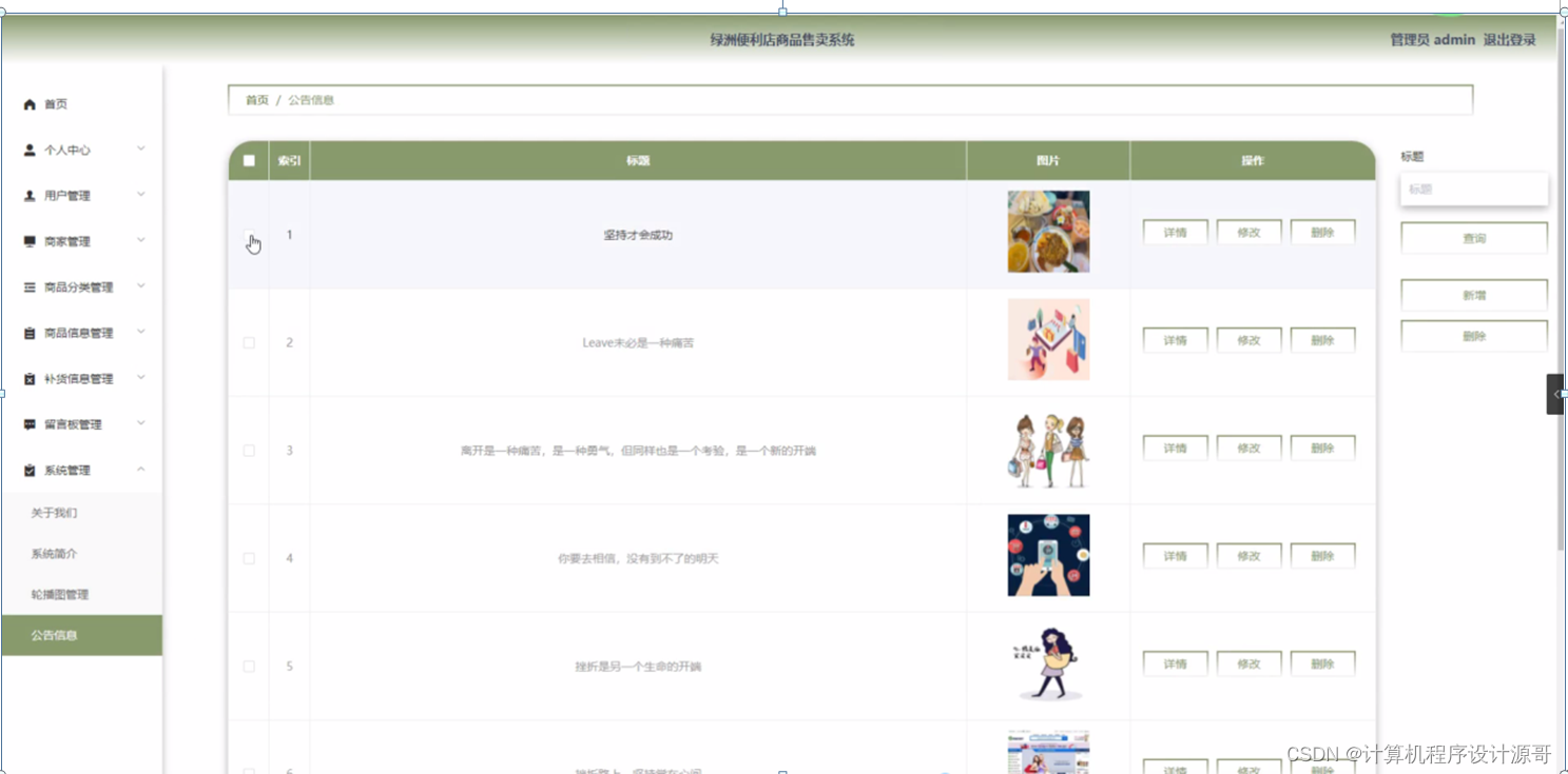 管理员点击系统管理。在公告信息页面输入标题进行查询、新增或删除公告信息列表,并根据需要对公告详情信息进行详情、修改或删除操作;还可以对关于我们、系统简介、轮播图管理进行相应操作;如图5-15所示: