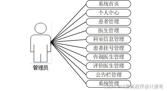 管理员登录使用本系统涉到的功能主要有个人中心、患者管理、医生管理、科室信息管理、患者挂号管理、咨询医生管理、评价医生管理、公告栏管理、系统管理等功能。管理员用例如图3-1所示。